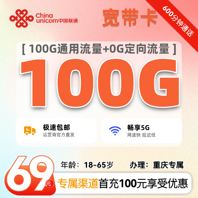 69元100G通用流量+600分钟通话+1000兆宽带+4张副卡