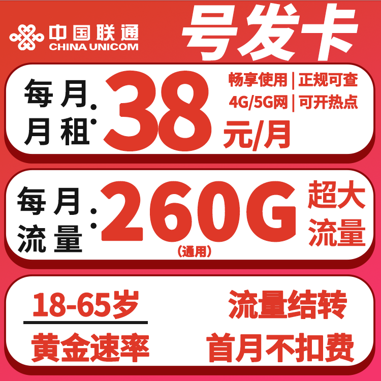 38元260G通用流量+ 0.15/分钟通话·付费提卡