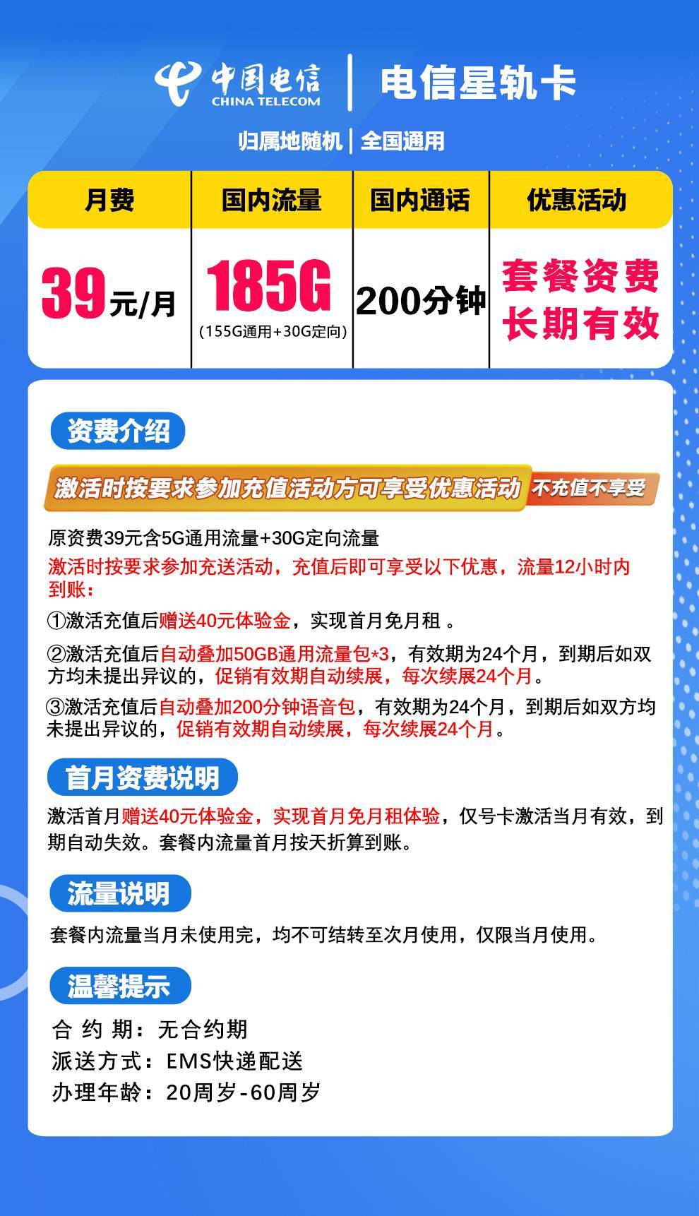 39元/月185G国内流量+200分钟通话+只发贵州省内地址