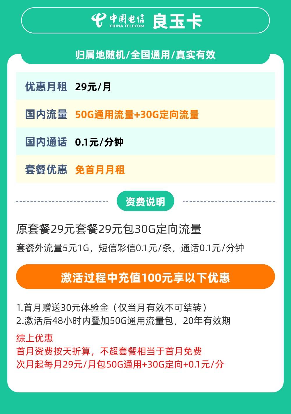 29元/月80G流量+0.1元/分钟·3个月后升级为170G流量