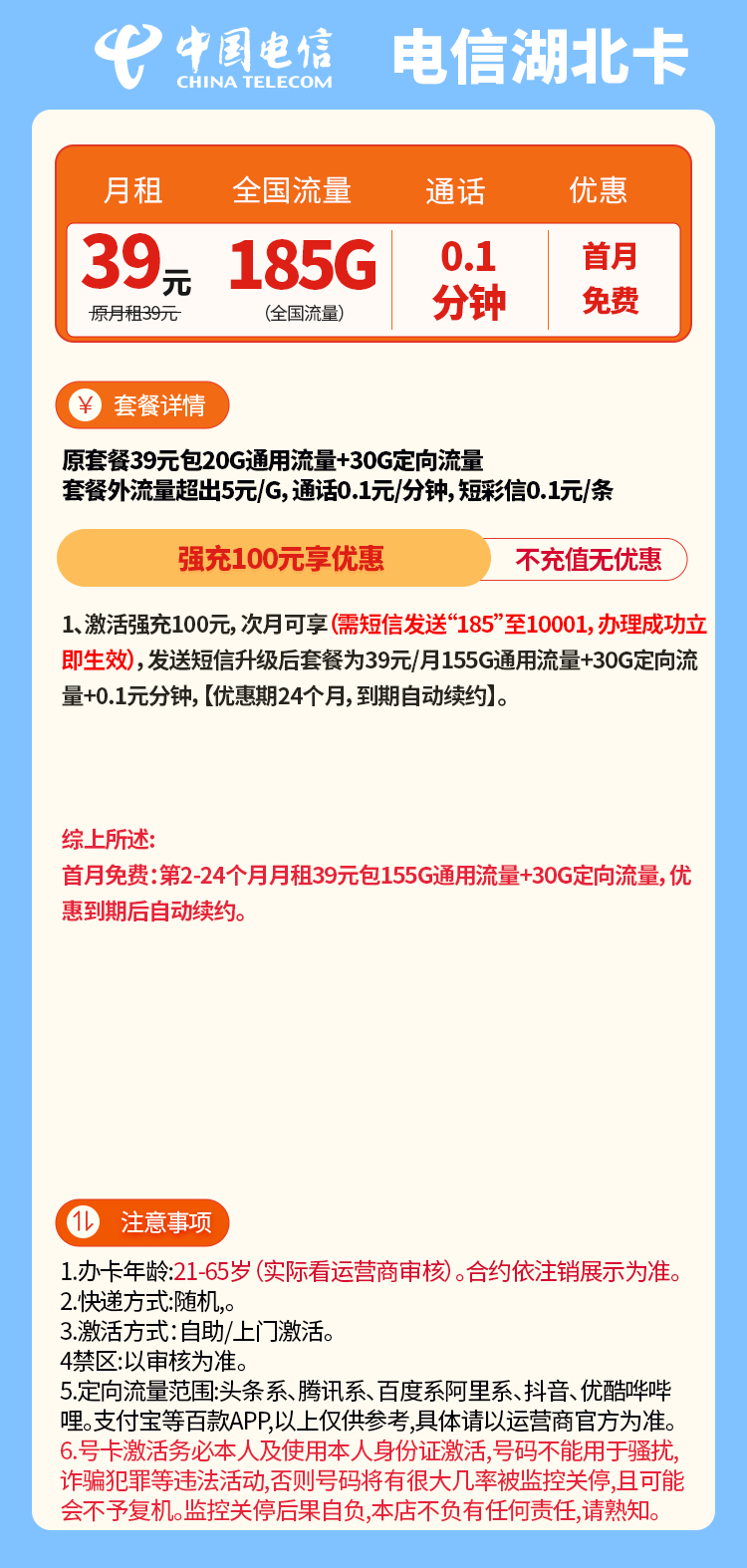 39元/月185G全国流量+0.1元/分钟通话·只发湖北