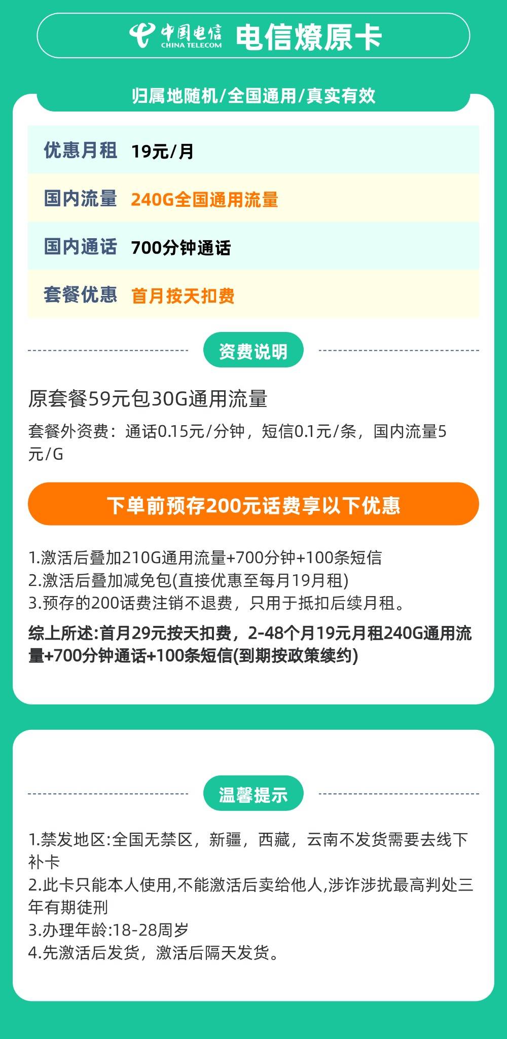 19元240G通用流量+700分钟+100条短信+付费提卡
