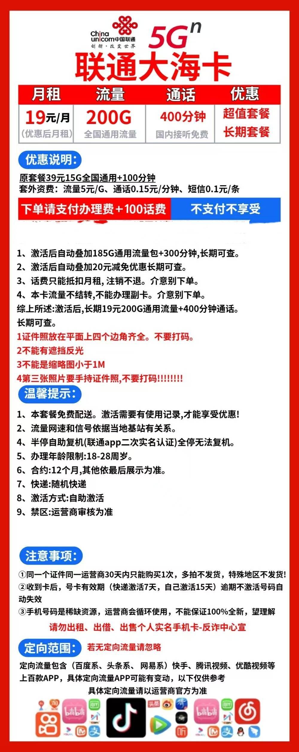 大海卡19元200G通用流量+300分钟发全国·咨询鼎锋下单