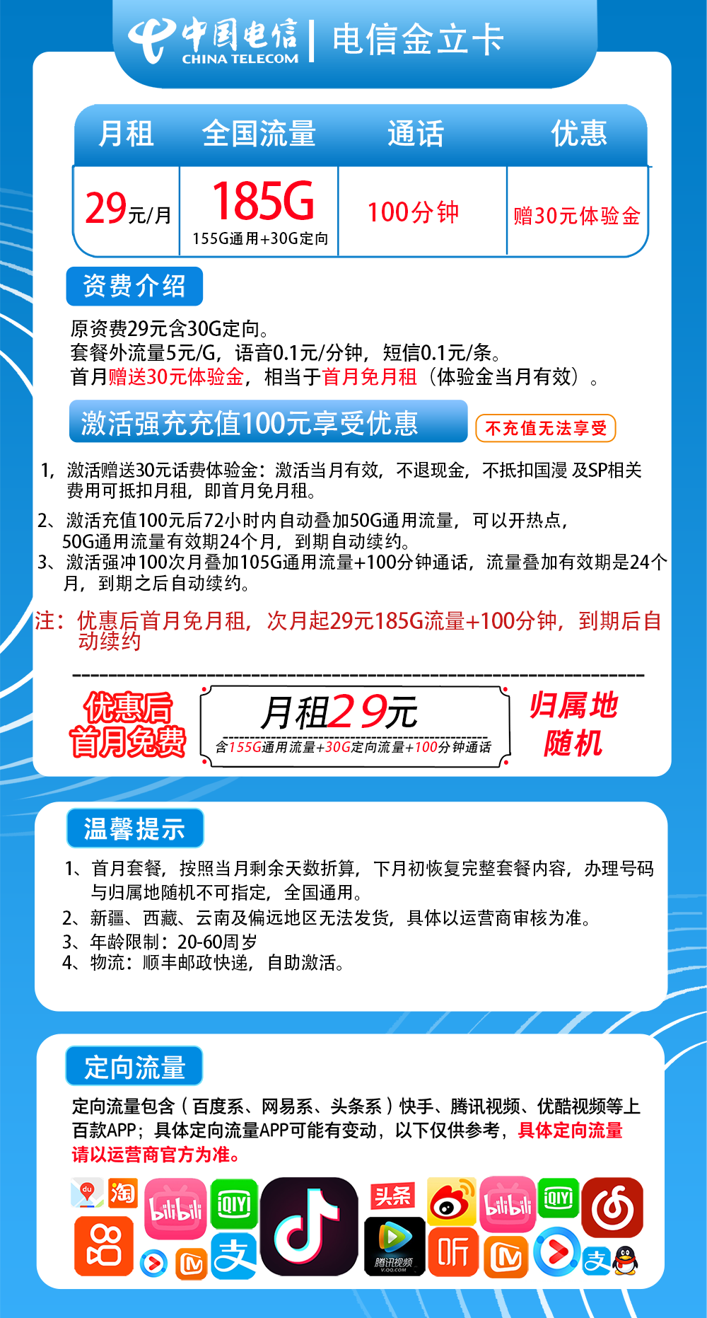 29元/月包185G全国流量+100分钟通话(其中105G流量30天后到账)