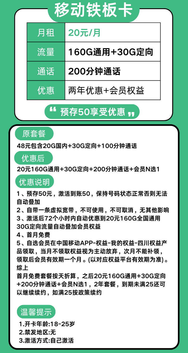 20元190G全国流量+200分钟通话+会员权益N选一·只发四川省内