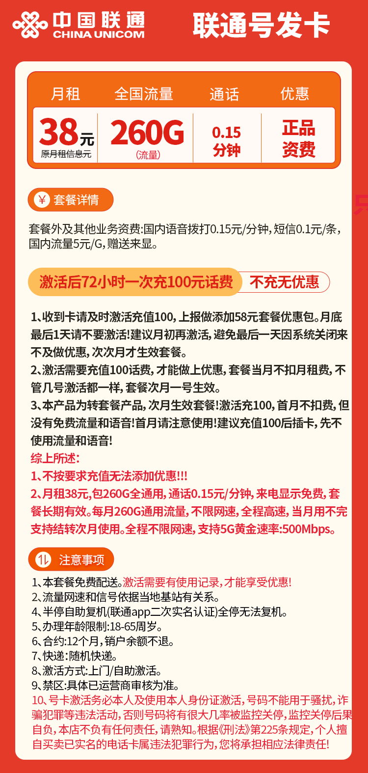 38元260G通用流量+ 0.15/分钟通话·付费提卡